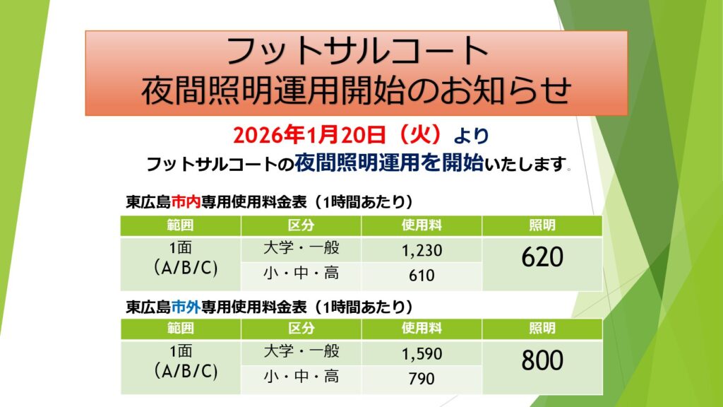 6Jan2026東広島運動公園フットサルコート夜間照明運用開始のお知らせ2026年1月6日お知らせ いつも東広島運動公園をご利用いただき、誠にありがとうございます。 東広島運動公園フットサルコート夜間照明の運用開始について、令和8年1月20日(火)からご利用できます。また、予約開始は、令和8年1月8日(木)からです。(予約方法については、東広島運動公園の公式サイトで最新情報を確認してください。) \ 最新情報をチェック / FacebookXBlueskyHatenaCopy