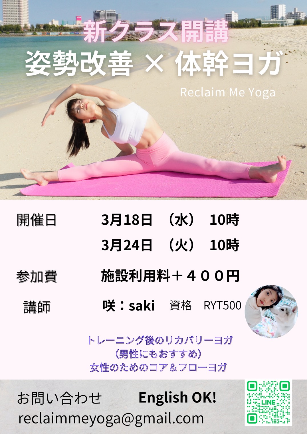 3/18(水)・3/24(火) 10:00~ (60) 姿勢改善×体幹ヨガ教室 担当:咲(saki)
