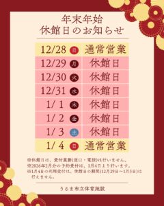 13Dec2025年末年始営業のご案内2025年12月13日平素は当施設のご利用ありがとうございます。 年末年始営業をご案内します。 ◇12月28日(日):通常営業 ◆12月29日(月)~1月3日(土):休館日 ◇1月4日(日):通常営業 《以下の点、ご確認ください》 ・休館日には受付業務(窓口・電話)は行いません。 ・2026年2月分の予約受付は1月4日より行います。 ・1月4日の利用受付は、12月29日~1月4日の間は行えません。 スケートボード場も閉場します。 ご協力よろしくお願いいたします。