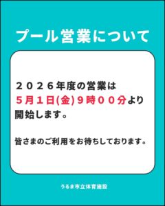 18Apr2026【勝連】プール営業開始のお知らせ2026年4月18日平素は当施設をご利用いただき、ありがとうございます。 勝連B&G海洋センタープールの営業日が決定しましたのでお知らせします。 2026年5月1日(金)9時00分より たくさんのご利用お待ちしています。