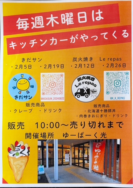 キッチンカー出店のお知らせ 投稿日: 2026年1月22日 投稿者: hikari いつもご利用ありがとうございます。 ゆーぱーく光では、2月より毎週木曜日にキッチンカーがやってきます。 クレープ・ドリンクや豚丼・肉巻きおにぎりのお店です。 販売 朝10時オープン~売切れまで 皆様のお越しをお待ちしております。