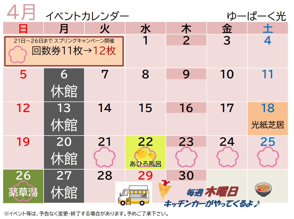 #ゆーぱーく光#光市の温泉#山口県光市三井#温泉♨️#サウナ風呂あり#11月のカレンダー
