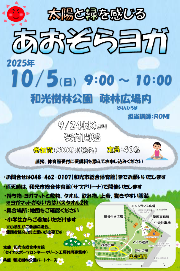 イベント・その他 本館からのお知らせ 10/5(日) あおぞらヨガ開催 いつも和光市総合体育館をご利用いただきありがとうございます。 あおぞらヨガの応募を開始いたしました!大人気のあおぞらヨガに是非ご参加ください。詳細は以下画像をご参照ください。