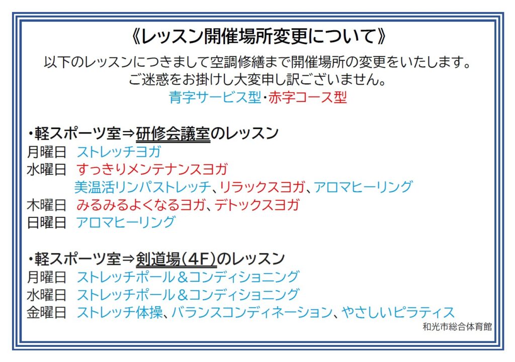 本館からのお知らせ 【レッスン開催場所変更について】 いつも和光市総合体育館をご利用いただきありがとうございます。 下記の画像のとおり一部のレッスンの開催場所を変更いたします。 ご迷惑をお掛けし大変申し訳ございません。