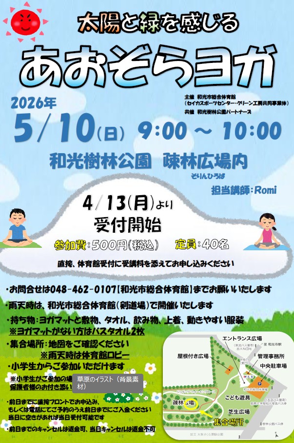 イベント・その他 本館からのお知らせ 5/10(日) あおぞらヨガ開催のお知らせ いつも和光市総合体育館をご利用いただきありがとうございます。 今年もあおぞらヨガの開催をいたします!大人気のあおぞらヨガに是非ご参加ください。詳細は以下画像をご参照ください。※4/13(日)~申込開始