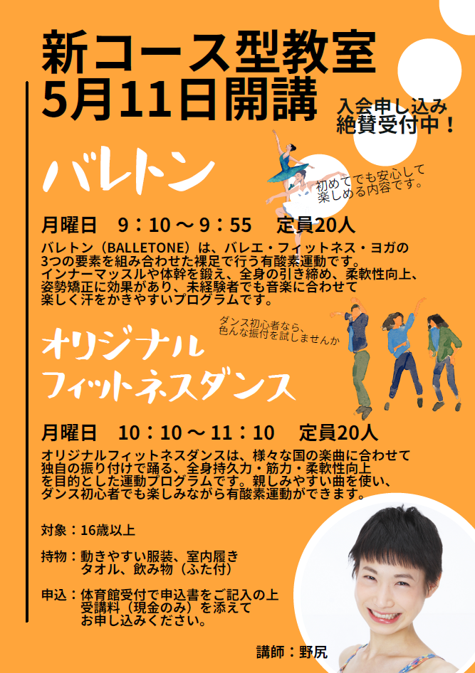 イベント・その他 本館からのお知らせ バレトン・オリジナルフィットネスヨガ受付開始! コース型教室として新たに2教室が開講いたします。詳しくは下記画像をご覧ください。ご参加ご希望の方は体育館受付けまで直接お申込みをお願いいたします。